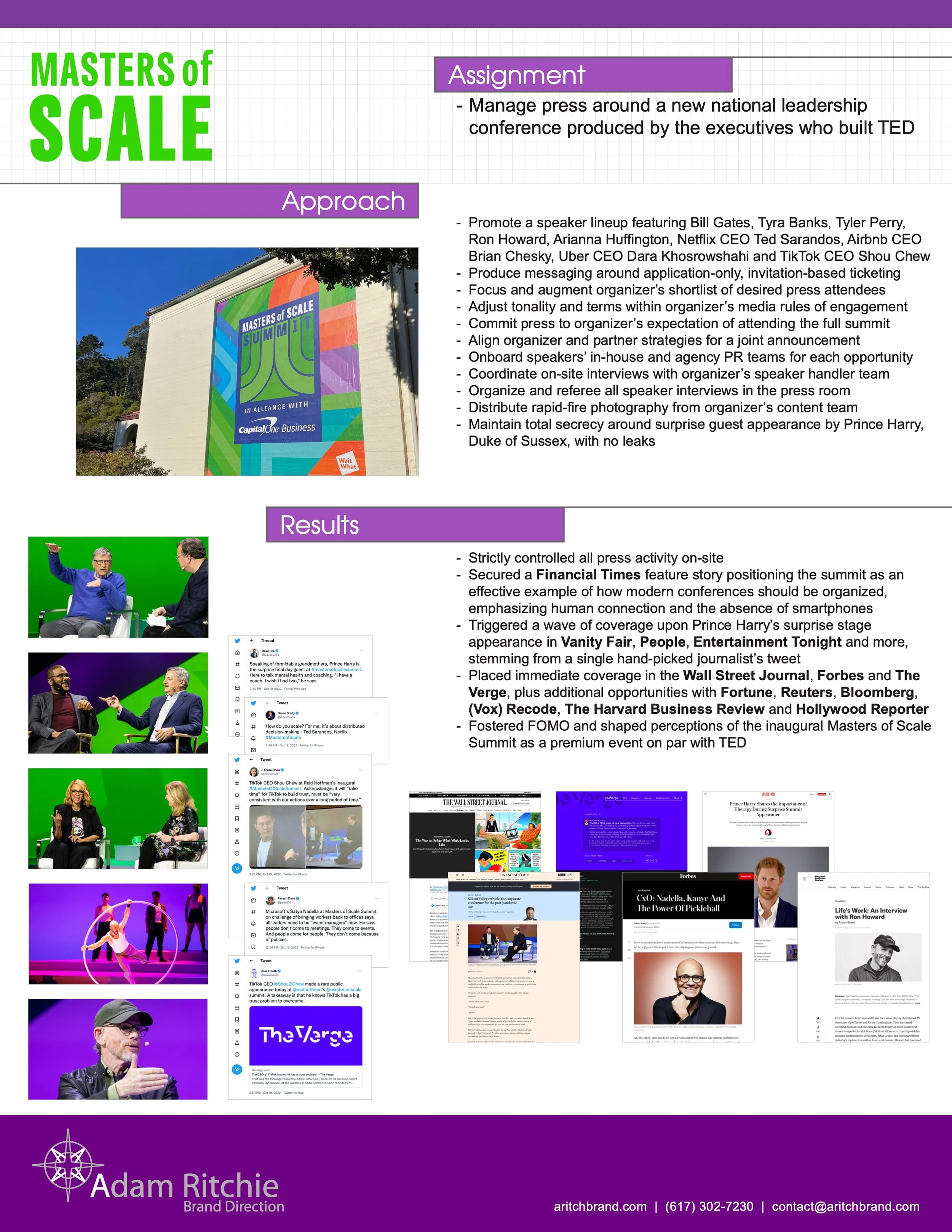 Adam Ritchie Brand Direction managed PR for the gathering of the most successful entrepreneurs in the U.S. at the Masters of Scale Summit in San Francisco, with speakers Bill Gates, Tyra Banks, Tyler Perry, Ron Howard, Arianna Huffington, Netflix CEO Ted Sarandos, Airbnb CEO Brian Chesky, Uber CEO Dara Khosrowshahi, TikTok CEO Shou Chew and Prince Harry, Duke of Sussex.