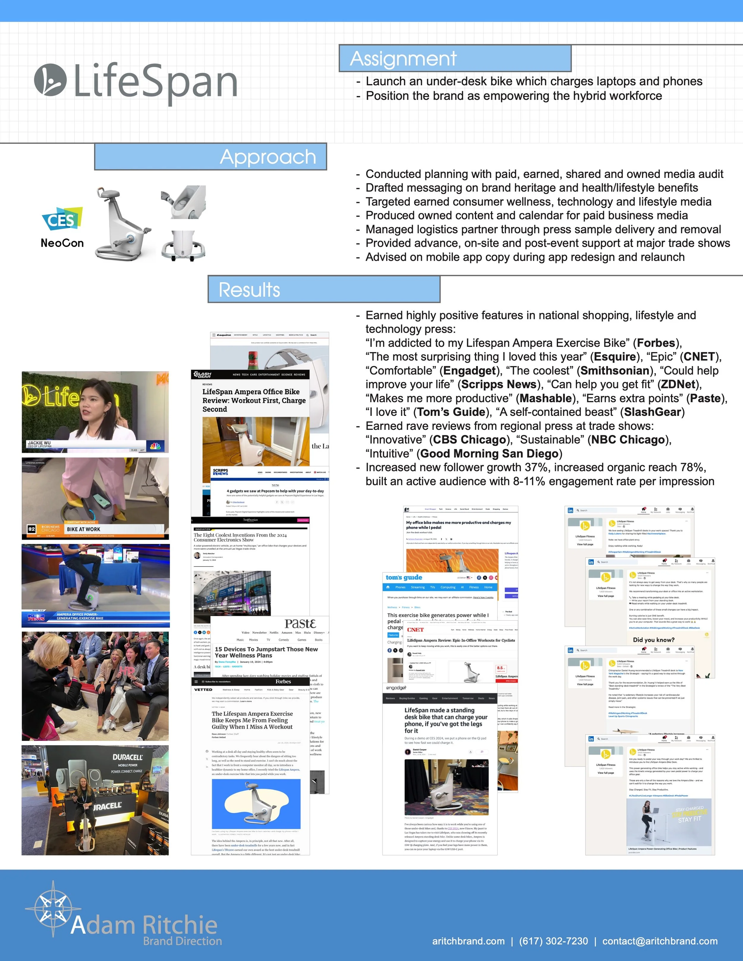 Adam Ritchie Brand Direction put treadmill desks and bike desks on the map for LifeSpan and directed a cultural shift that changed the way we work. Principal Adam Ritchie embraced the product and used it to walk from the East Coast of the U.S. to the West Coast of the U.S. three times.