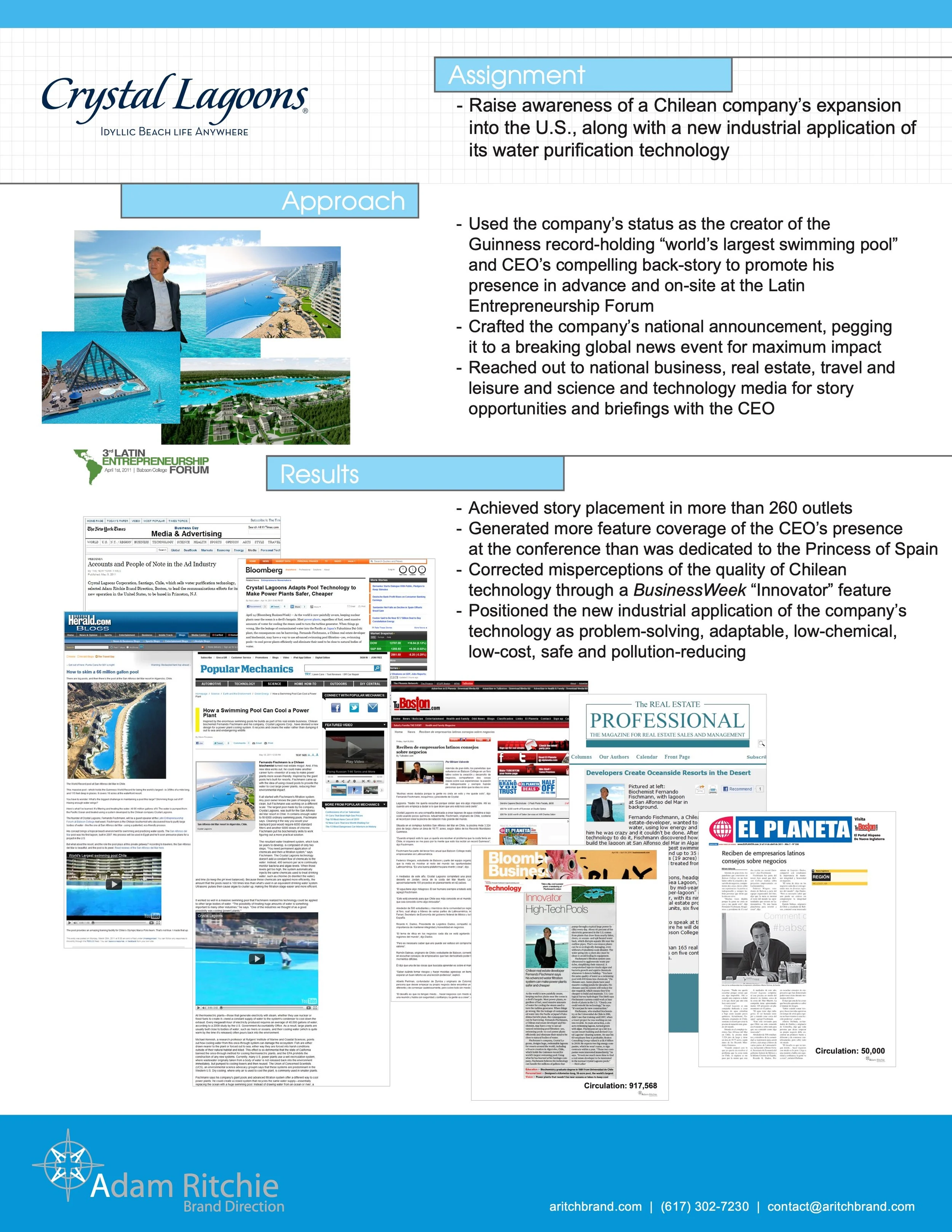 Adam Ritchie Brand Direction helped the global technology brand Crystal Lagoons successfully launch in the U.S., earning its ambitious technology coverage in top U.S. business and tech media and establishing its credibility among U.S. stakeholders.